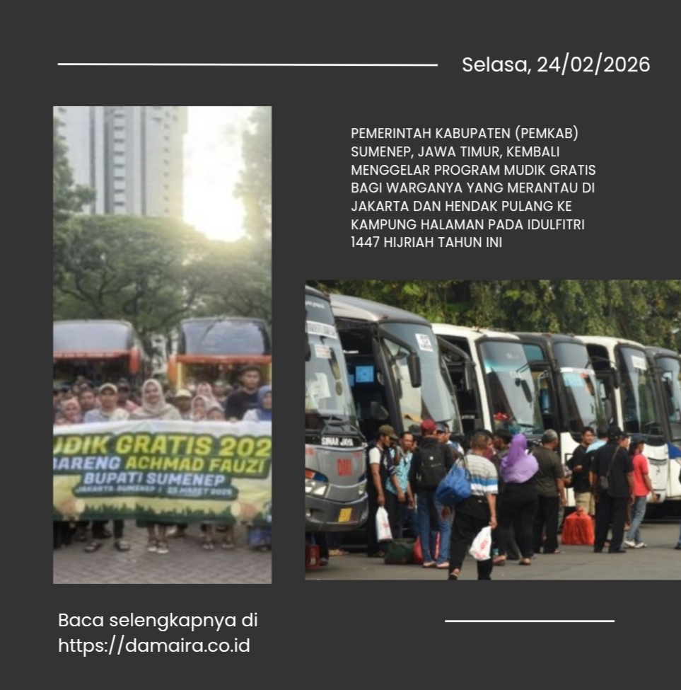 DAMAIRA.CO.ID, SUMEMEP-Pemerintah Kabupaten (Pemkab) Sumenep, Jawa Timur, kembali menggelar program mudik gratis bagi warganya yang merantau di Jakarta dan hendak pulang ke kampung halaman pada Idulfitri 1447 Hijriah. Program ini bertujuan meringankan beban biaya transportasi para perantau saat Lebaran.